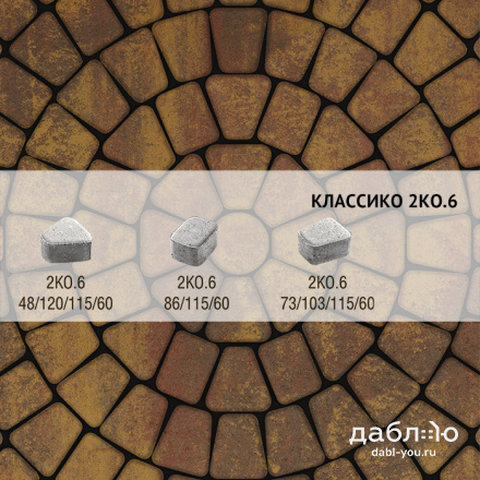 Брусчатка Выбор Классико Листопад 2КО.6 М Осень. Бетонная тротуарная плитка из серии Классико. Эта коллекция отличается сходством с натуральным камнем и правильной геометрической формой.Высота: 60 мм