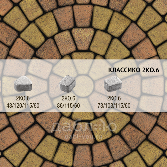 Брусчатка Выбор Классико Листопад 2КО.6 М Саванна. Бетонная тротуарная плитка из серии Классико. Эта коллекция отличается сходством с натуральным камнем и правильной геометрической формой.Высота: 60 мм
