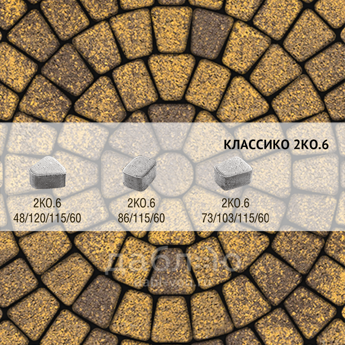 Брусчатка Выбор Классико Листопад 2КО.6 М Янтарь. Бетонная тротуарная плитка из серии Классико. Эта коллекция отличается сходством с натуральным камнем и правильной геометрической формой.Высота: 60 мм