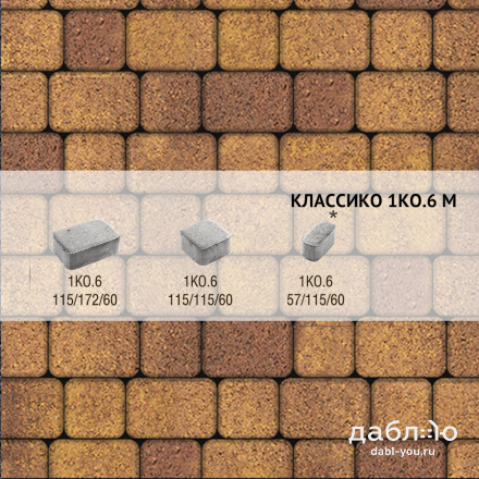 Брусчатка Выбор Классико Листопад гранит 1КО.6 Осень. Бетонная тротуарная плитка из серии Классико. Эта коллекция отличается сходством с натуральным камнем и правильной геометрической формой.Высота: 60 мм
