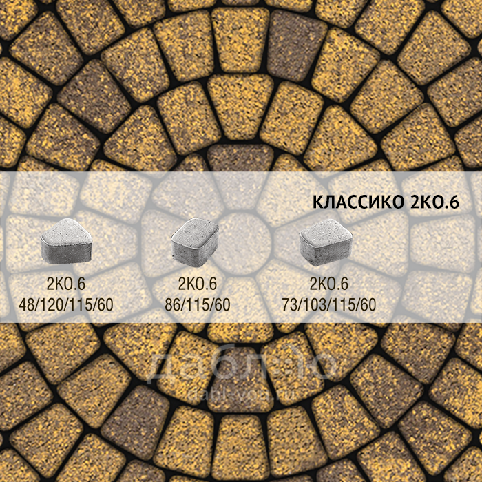 Брусчатка Выбор Классико Листопад гранит 2КО.6 М Янтарь. Бетонная тротуарная плитка из серии Классико. Эта коллекция отличается сходством с натуральным камнем и правильной геометрической формой.Высота: 60 мм