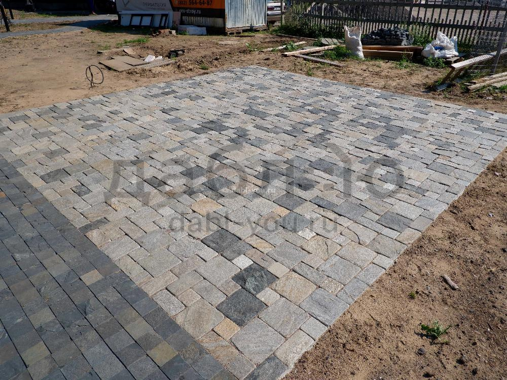 Брусчатка из кварцита морская волна галтованная 100x100x20-30 мм. Эта брусчатка со звучным название "морская волна" так и манит взгляд и навевает мысли о побережье. Подходит для мощения дорожек и парковок.- Вес: 70 кг/м2
