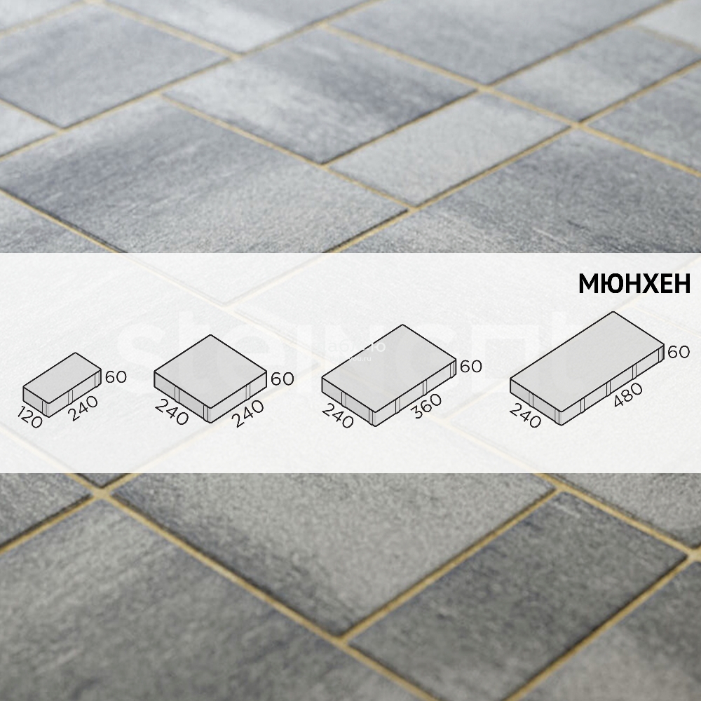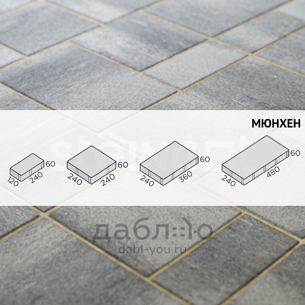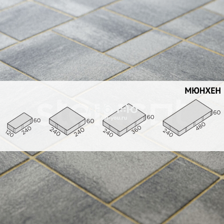Брусчатка Steingot Мюнхен Штайн Сильвер. Состоящая из четырех камней разного размера форма «Мюнхен» позволяет использовать при укладке огромное количество схем раскладки: линейную, разнонаправленную, паркетную и многие другие. Оригинальная форма, созданная специально для воплощения разнообразных и неповторимых дизайнов благоустройства. Продажа брусчатки производится кратно целым поддонам!- Высота: 60 мм