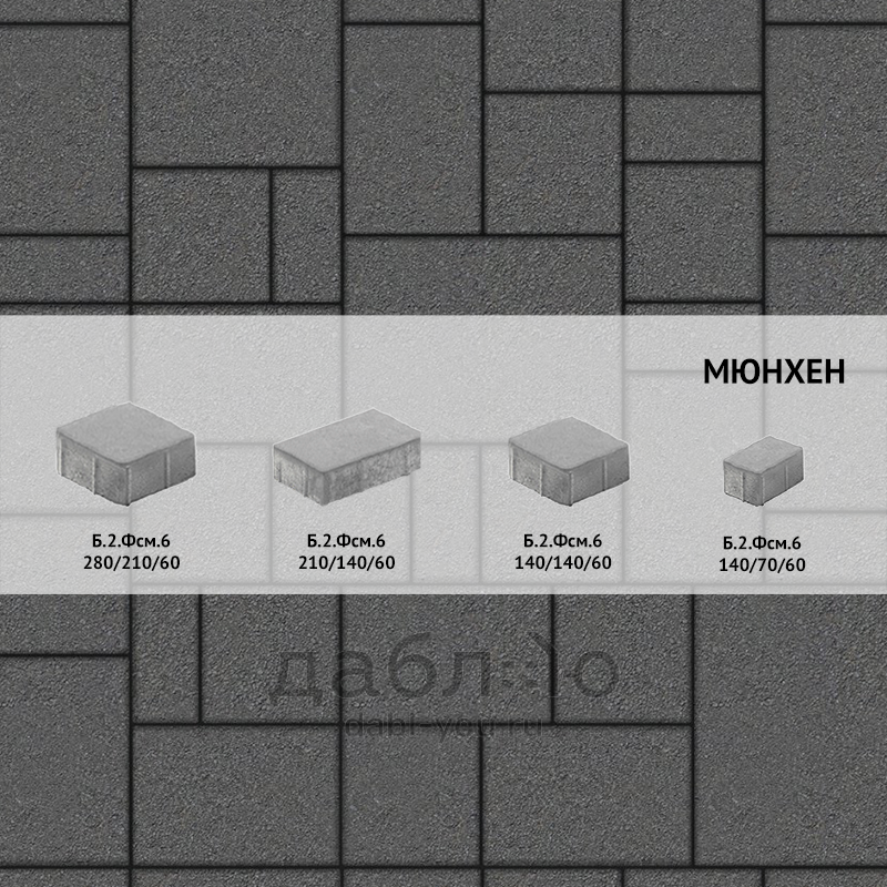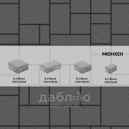 Брусчатка Выбор Мюнхен Стандарт гладкий Б.2.Фсм.6 Серый. Мультиформатная форма «Мюнхен» включает комплект из четырех камней разных размеров. Рисунок не имеет выраженной направленности, подходит как для мощения площадок, так и узких, криволинейных участков, без необходимости прерывания сплошной укладки.Толщина, мм: 60