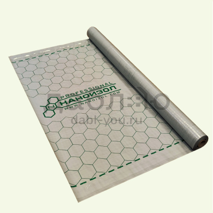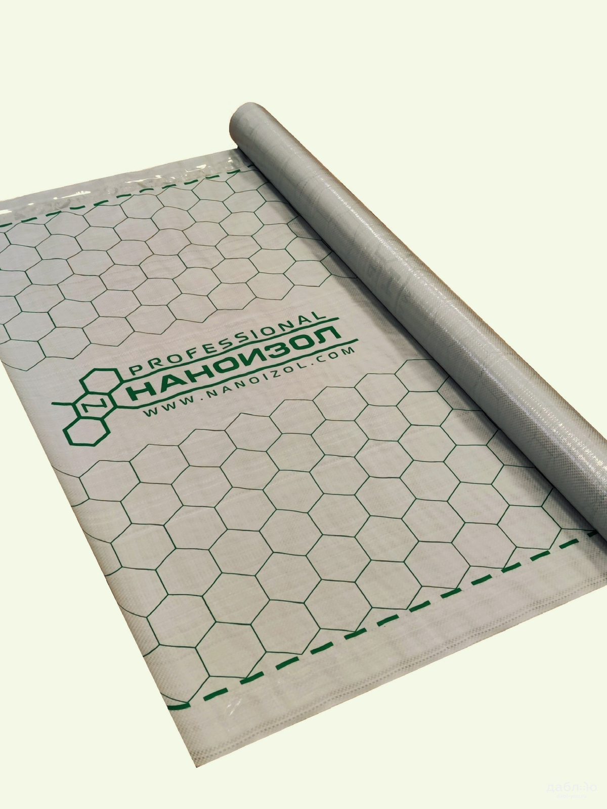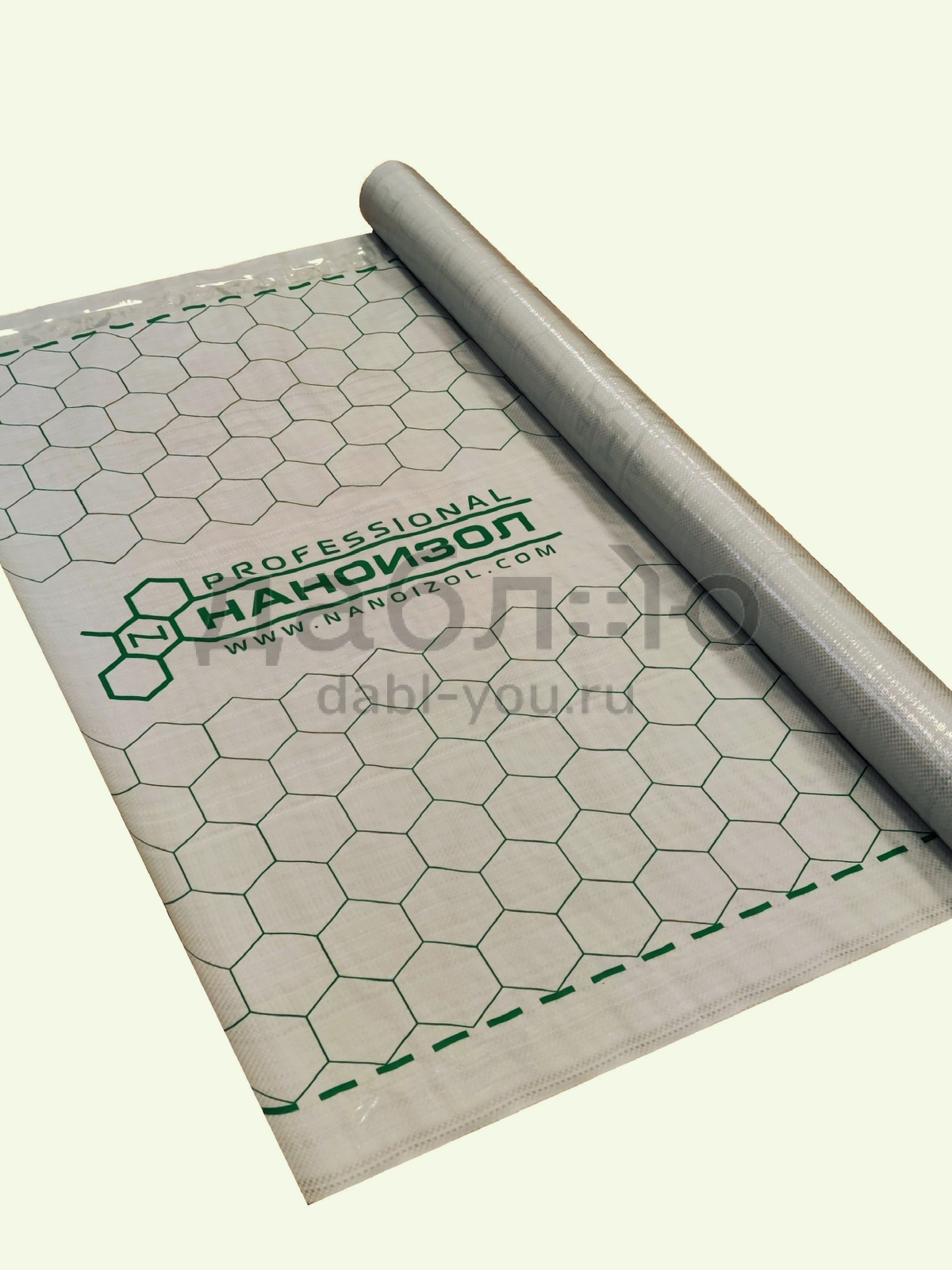 Гидро-пароизоляция высокой прочности Наноизол D Professional. Гидроизоляционные свойства мембраны обеспечивают защиту неутепленных кровельных конструкций от проникновения влаги внутрь чердачного помещения; пароНЕпроницаемость обеспечивает защиту стеновых и кровельных конструкций, а также утеплителя в них от водяного пара, возникающего внутри помещения; благодаря своей структуре защищает внутреннее пространство помещения от проникновения в него частиц утеплителя и другой конструкционной пыли; высокие прочностные характеристики позволяют выдерживать значительные механические нагрузки (в том числе ветровые, снеговые и дождевые) на этапе монтажа и в процессе эксплуатации; тканная структура материала, а также наличие УФ-стабилизаторов позволяет использовать материал в качестве временной кровли и при консервации объектов; устойчивость к большинству кислот и щелочей позволяет использовать материал в конструкциях на бетонном основании (плоские кровли, стяжки); нанесенная разметка позволяет избежать ошибок на этапе монтажа, а также эффективно использовать полезную площадь материала; клеевая полоса обеспечивает герметичность нахлестов между полотнами и значительно увеличивает скорость монтажа.Плотность, г/м2: 95