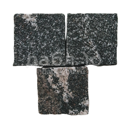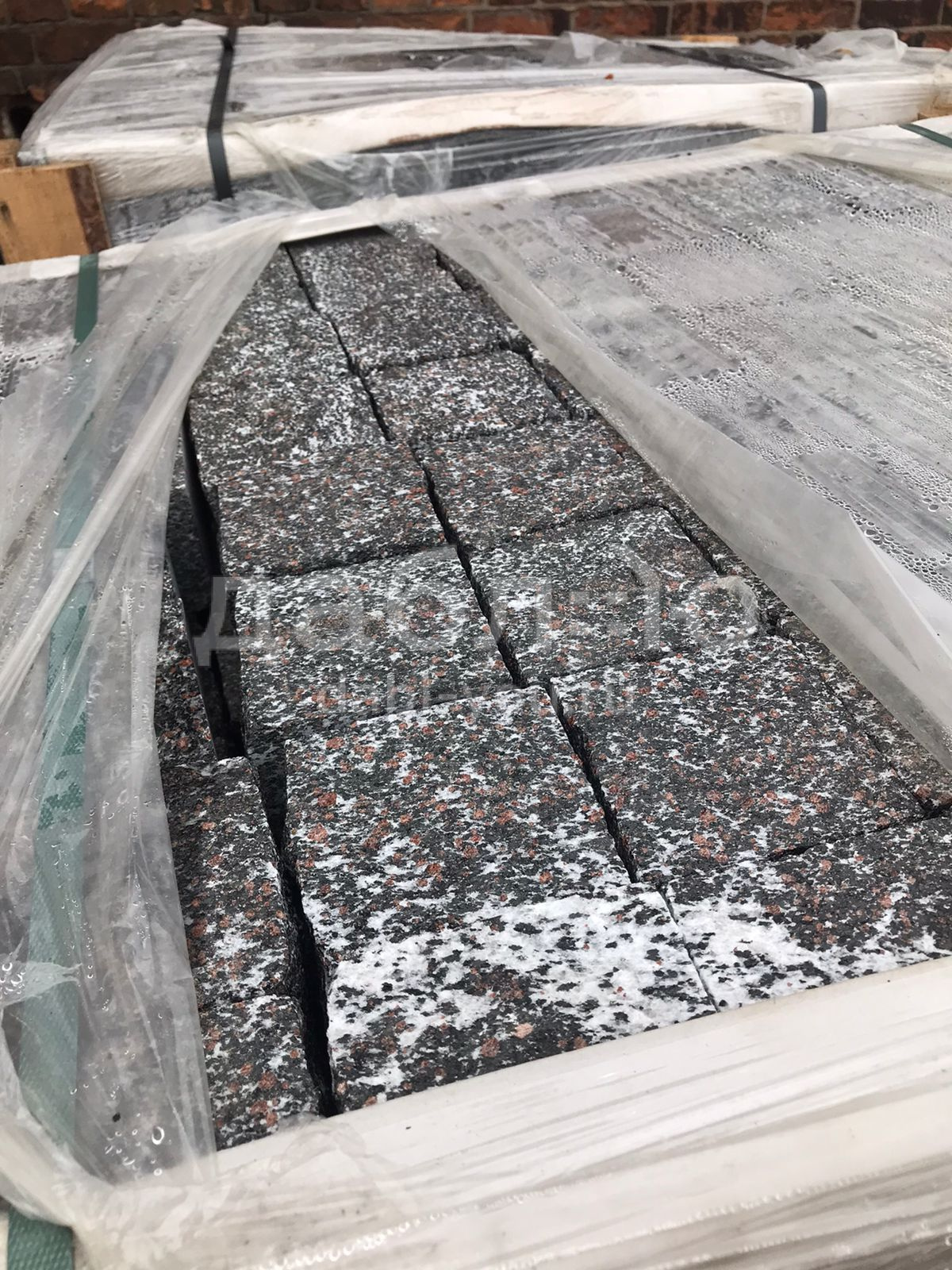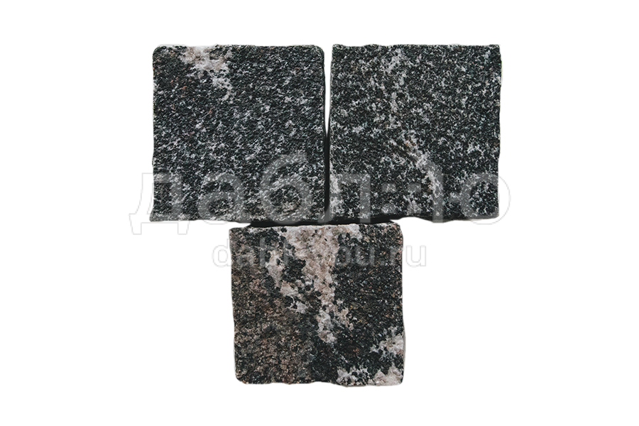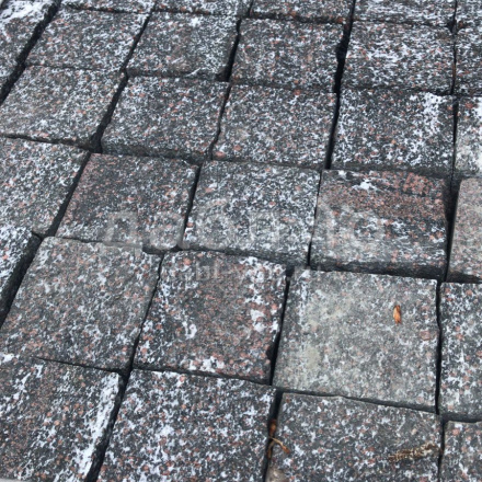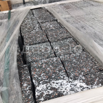 Брусчатка из серо-фиолетового гранита с белыми вкраплениями. Размер 100*100*80 мм. Верхняя грань термо, остальные четыре грани пилено - колотые. Применяется для мощения как в частном секторе, так и в градостроительстве.