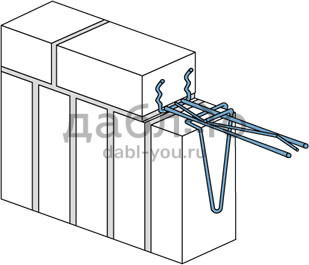 Вертикальная перемычка. Самым распространенным типом кладки перемычек является вертикальная кладка. В этом случае кирпич может быть как полнотелым, так и пустотелым. Иногда, для достижения большего эффекта, первые 2 ряда кладки над проемом выполняются вертикально. Сочетание горизонтальной кладки фасада с вертикальной - один из излюбленных архитектурных приемов. Часто кладка перемычек в один, два или три ряда служит началом целого пояса вертикальной кладки. Разновидностью вертикальной кладки является кладка перемычки в полтора кирпича. Чередование горизонтальных швов в перемычке создает интересный, запоминающийся рисунок. При монтаже вертикальной перемычки используются хомуты SK 50-170 или SK 50-270 и SU 50-45. Хомуты SK 50-170 располагаются в растворе, в каждом втором вертикальном шве первого ряда кладки.
