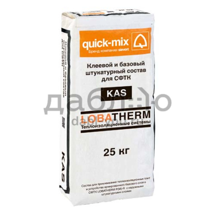 Клеевой и базовый штукатурный состав для СФТК Quick-Mix KAS, 25 кг. Состав для приклеивания теплоизоляционных плит и устройства армированного базового слоя в СФТК LOBATHERM P(M) с наружными штукатурными слоями.- влажность сухой смеси: не более 0,2%