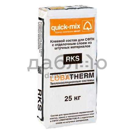Клеевой состав для СФТК с отделочным слоем из штучных материалов Quick-Mix RKS, 25 кг. Минеральный клеящий раствор для фиксации или приклеивания теплоизоляционных плит и керамической плитки. Высокая адгезионная способность. Водоотталкивающие свойства. Для наружных и внутренних работ.- Прочность на сжатие ˃ 10 МПа