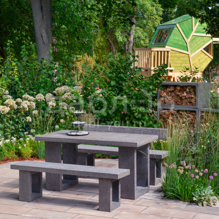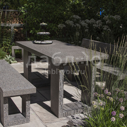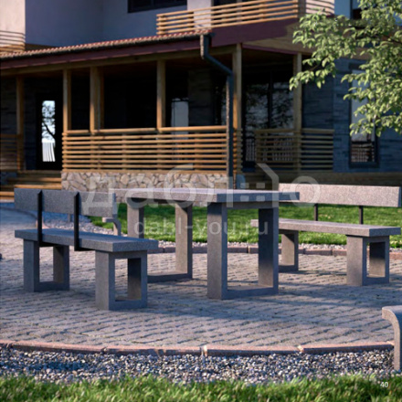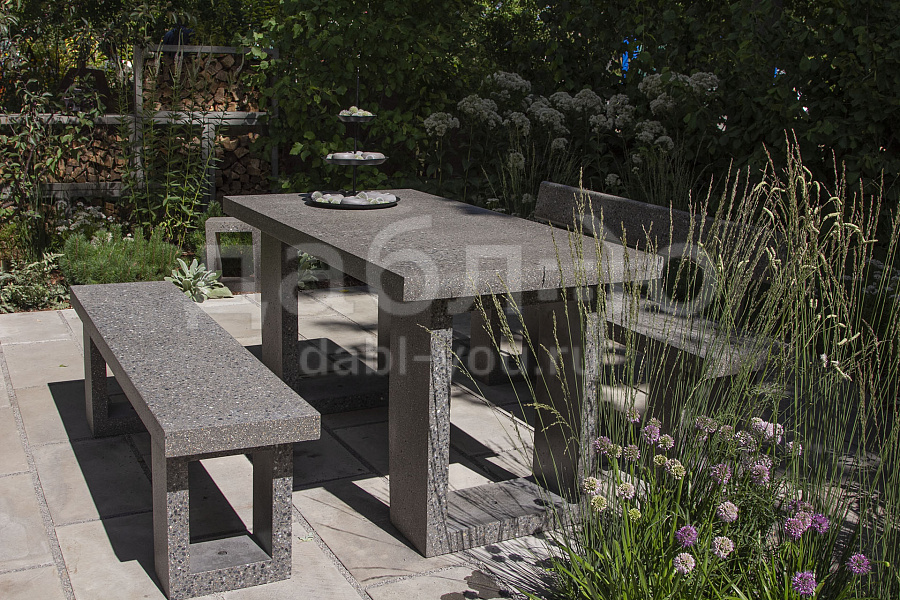 Комплект мебели из бетона Concretika. Мебель из фибробетона долговечна, благодаря возможности закрепления ножек скамеек и стола на горизонтальной поверхности приобретает дополнительную устойчивость. Стол и скамьи прекрасно комбинируются с остальными продуктами CONCRETIKA.Характеристики