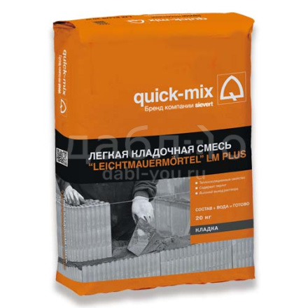Легкая кладочная смесь Quick-Mix LM plus, 20 кг. Легкая кладочная смесь, предназначенная для кладки из поризованных крупноформатных камней, а также для заполнения щелей и пустот. Оптимизированная рецептура для частного домостроения.- Плотность затвердевшего раствора ≤ 1150 кг/м³