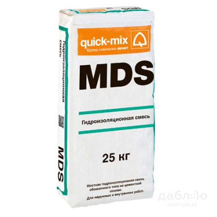 Минеральный гидроизолирующий раствор Quick-Mix MDS, 25 кг. Гидроизоляционный раствор MDS применяется для гидроизоляции выдержанных, прочных, не подвергающихся деформациям, жестких и ровных оснований, таких как: бетон, цементная штукатурка или стяжка, каменная кладка с заполненными швами.- Прочность на сжатие: > 10 МПа