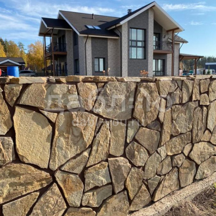 Песчаник тигровый рваный край толщиной 20 мм. Подходит для облицовки цоколей и фасадов. Оттенок желто-коричневый с темными разводами. Природный камень морозостойкий, прочный и долговечный. Рваная фактура отлично смотрится на больших площадях.- Вес: 50 кг м2