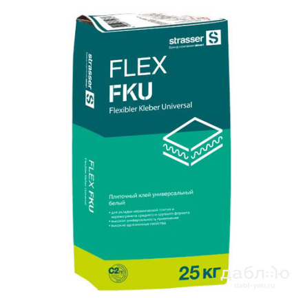 Плиточный клей универсальный (C2 TE) strasser FLEX FKU. Эластичный экономичный клей для нанесения тонким слоем с высокими адгезионными свойствами и стойкостью к сползанию. Удобен в применении. Для стен и полов. Для внутренних и наружных работ.- Толщина слоя ≤ 5 мм