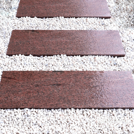 Пошаговая плита из гранита Винга. Применяется для создание пошаговых дорожек и в качестве элемента ландшафтного дизайна дома. Будет хорошо сочетаться с такими материалами как галька или крошка.Характеристики