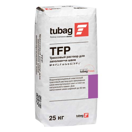 Трассовый раствор для заполнения швов Tubag TFP антрацит, 25 кг. Водонепроницаемый, эластичный раствор для заполнения швов. Особенно предназначен для широких швов до 5 см, например при укладке многоугольных плит. Высокая адгезия с боковыми стенками плит. Преимущественно для пешеходной нагрузки- Температура применения: от + 5ºС до 30ºС
