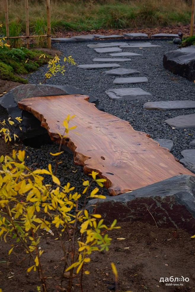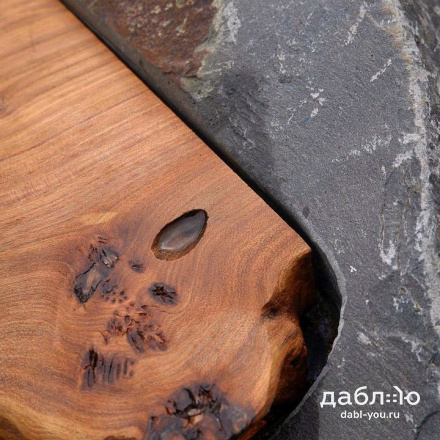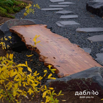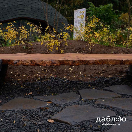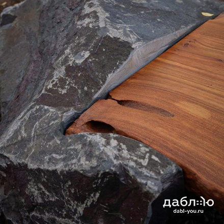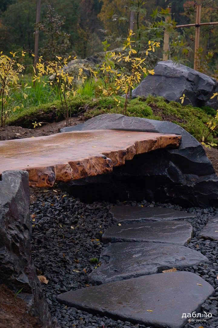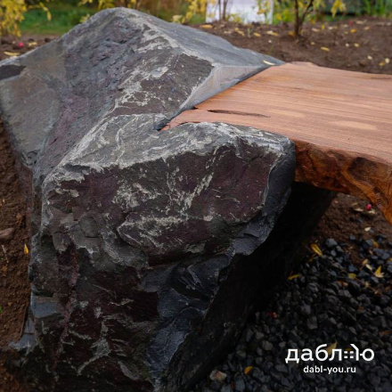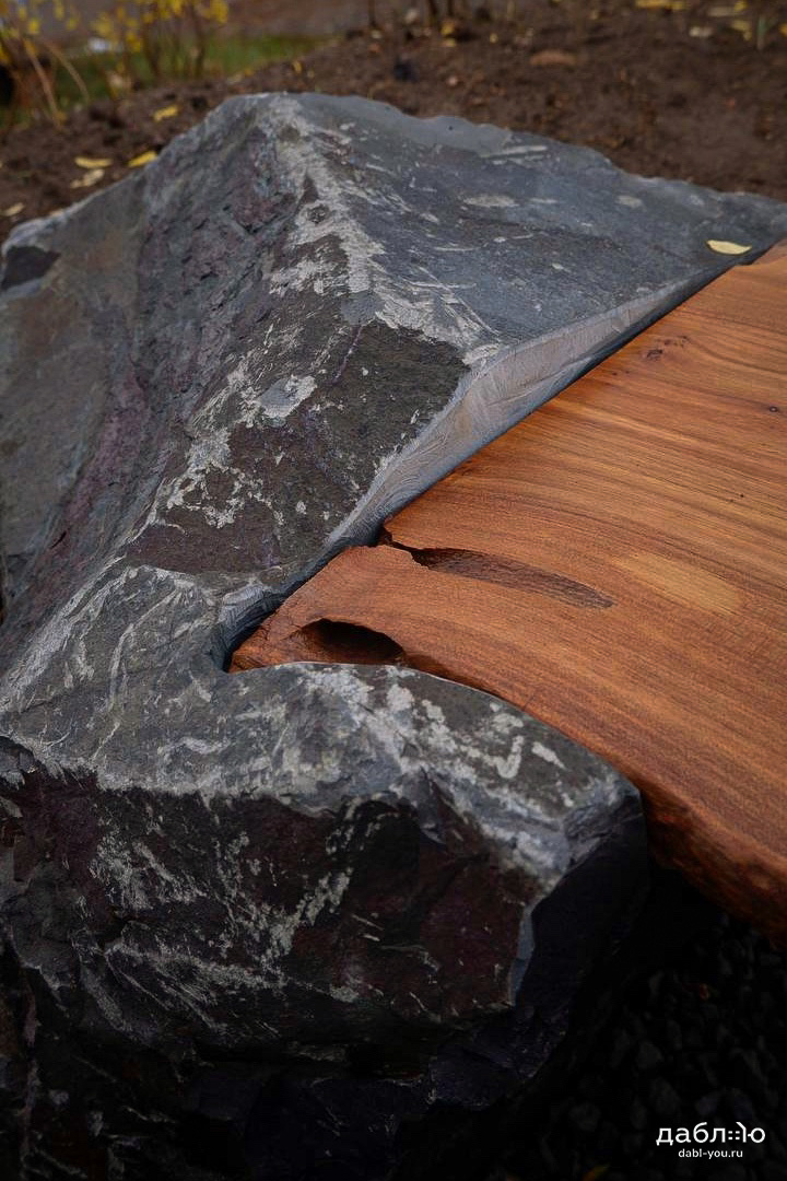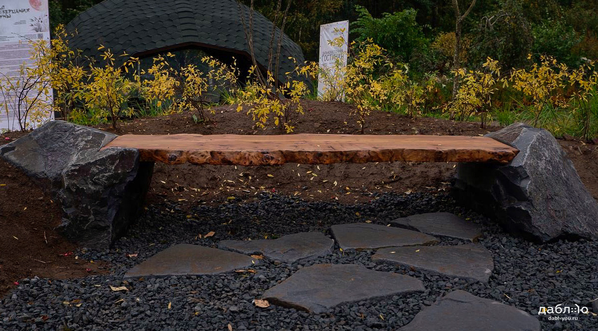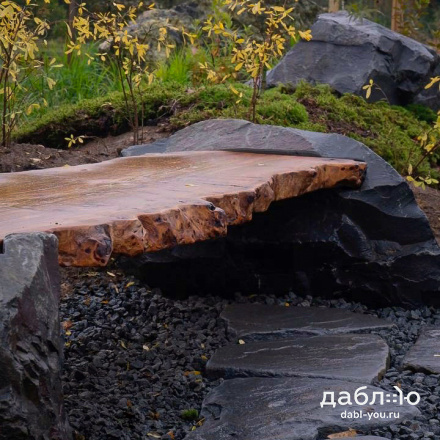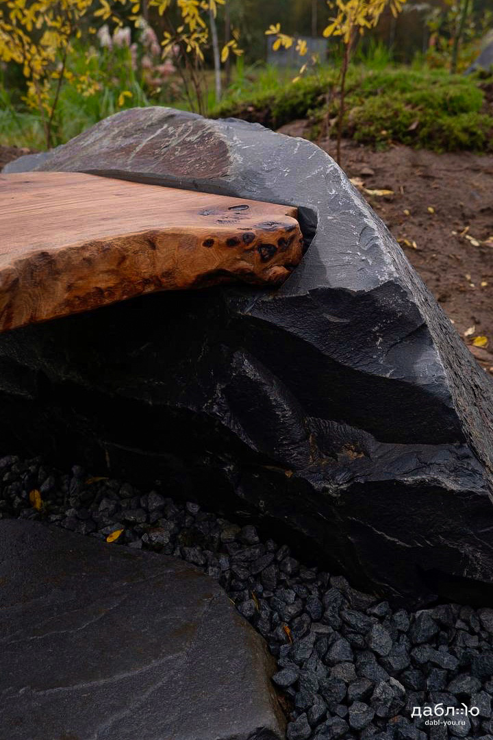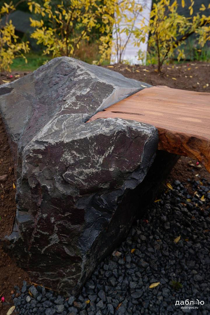 Скамейка из валунов №1. Скамья изготовлена из специально подобранного дерева и валунов под Ваши вкусы.