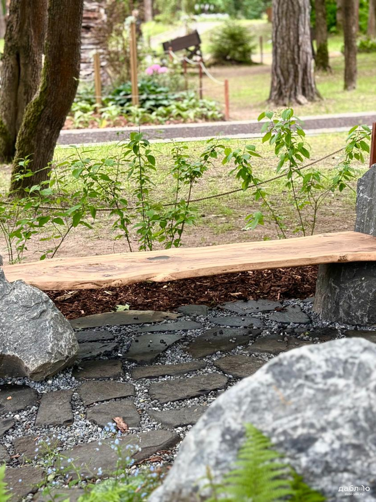 Скамейка из валунов №4. Скамья изготовлена из специально подобранного дерева и валунов под Ваши вкусы.