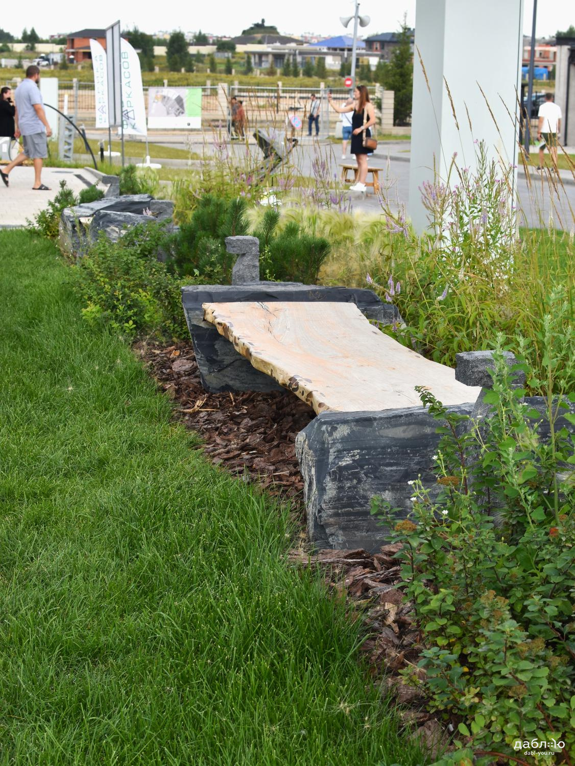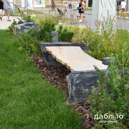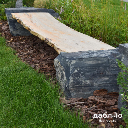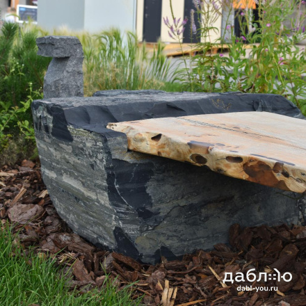 Скамья из валунов шунгита с деревянной поверхностью из азиатского карагача