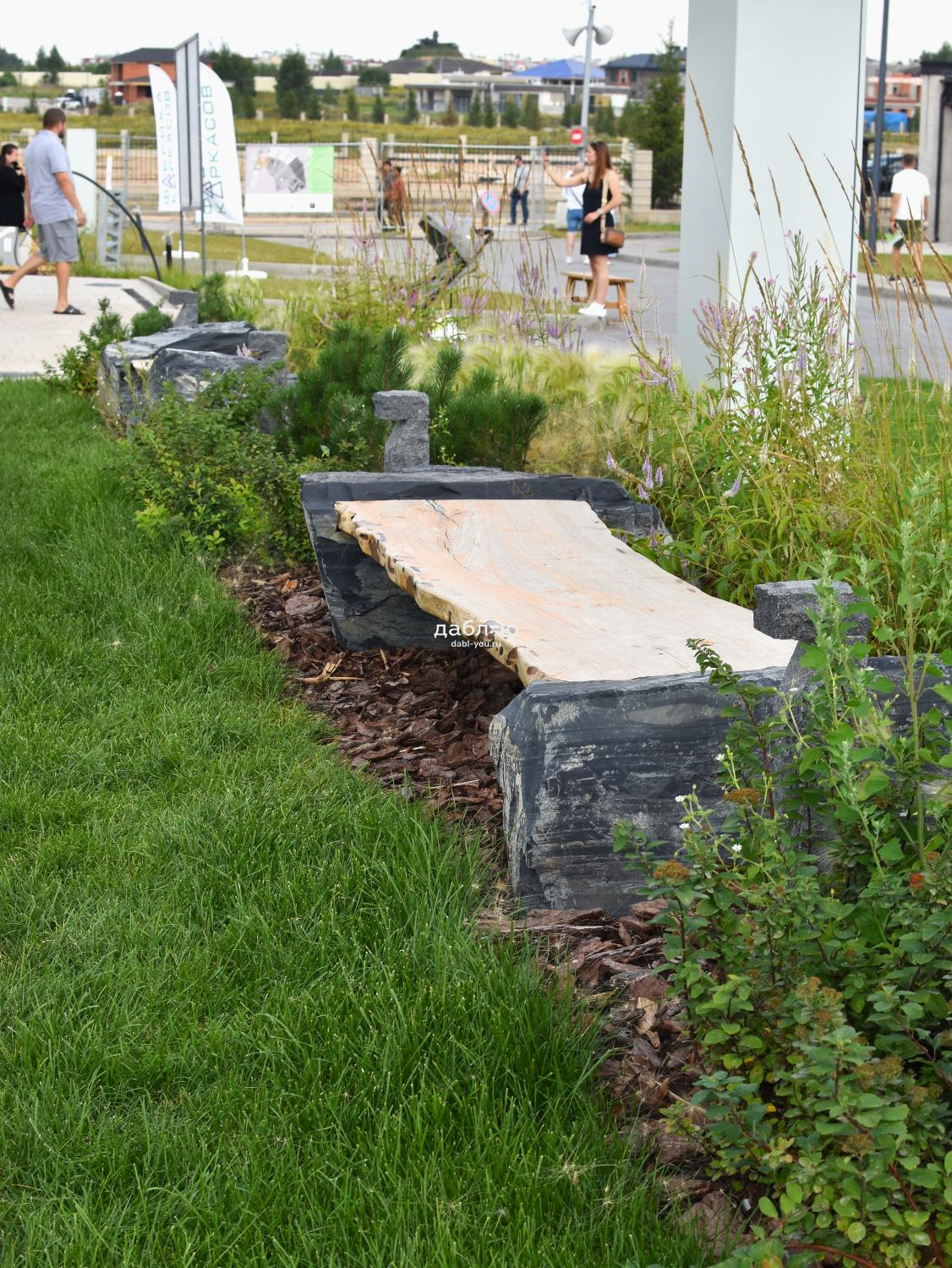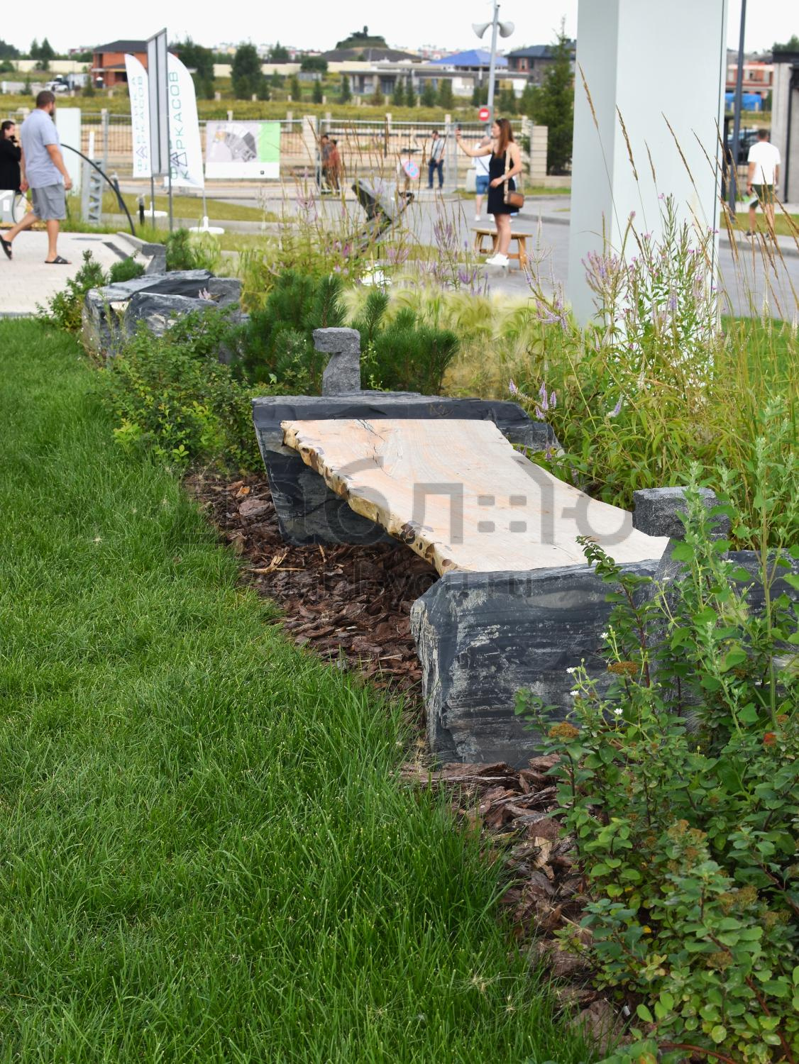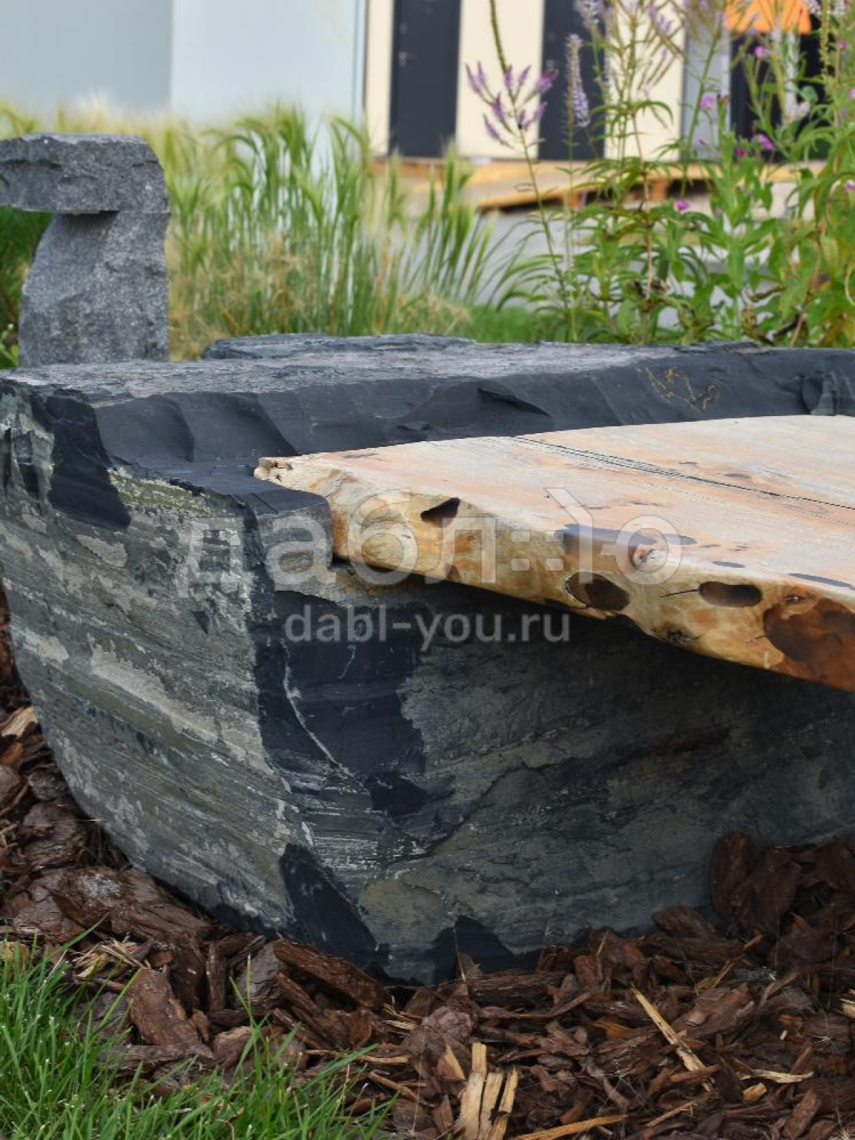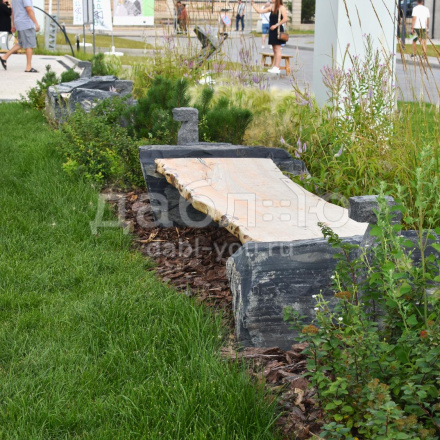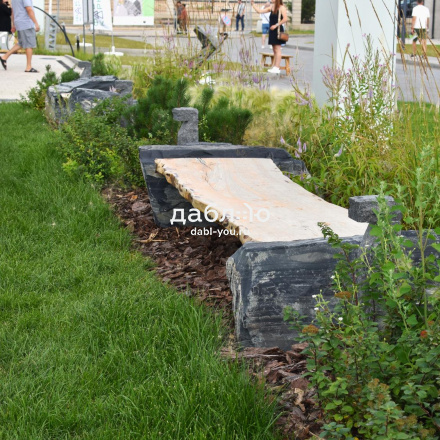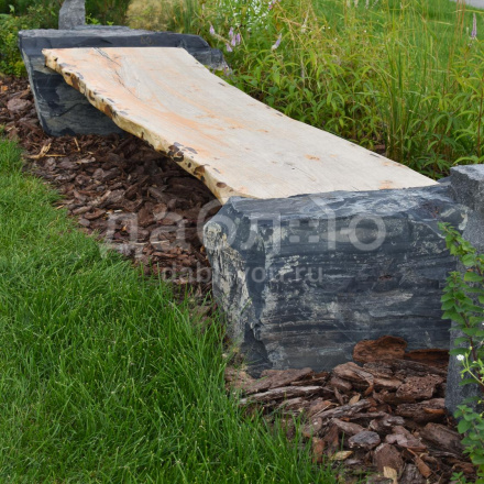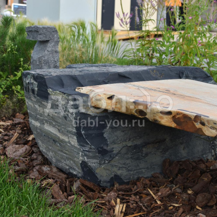 Фактура: природный камень — валуны шунгита, скамья из массива азиатского карагача