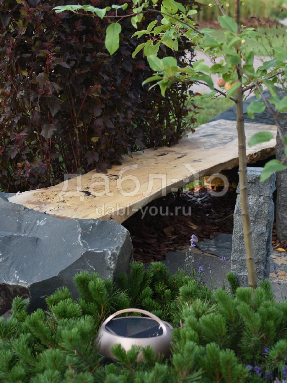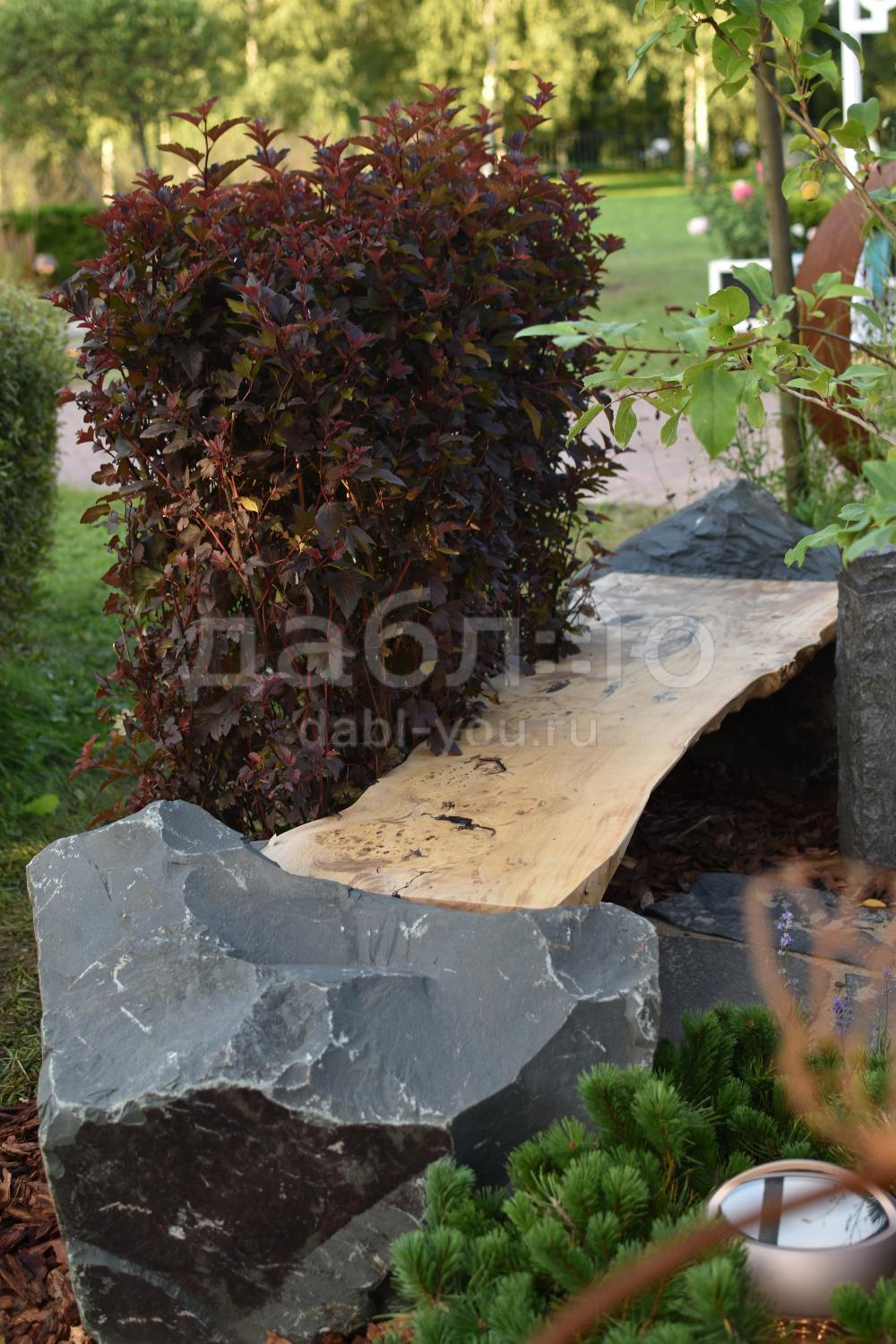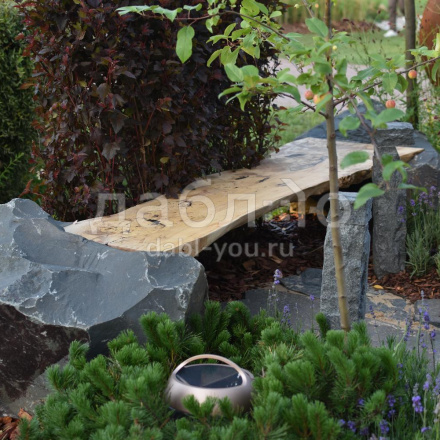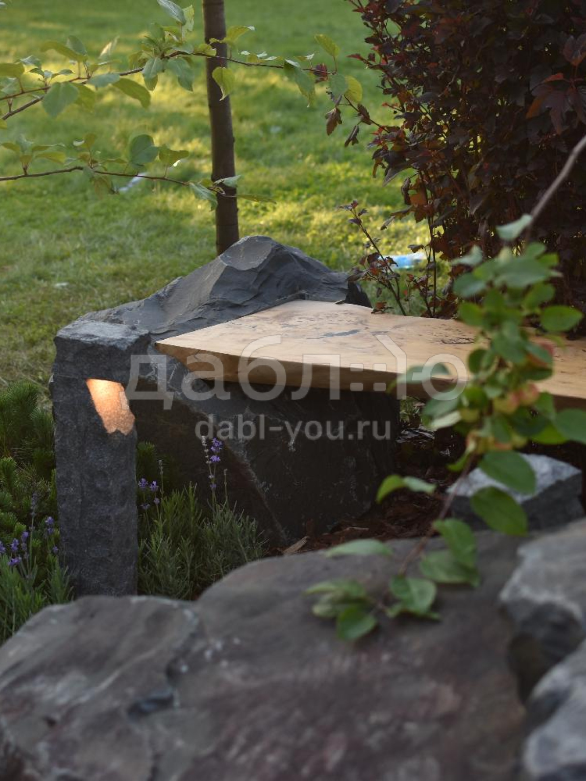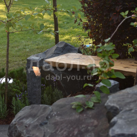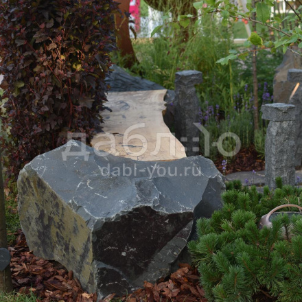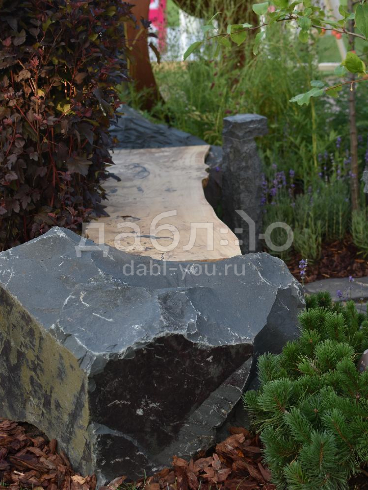 Фактура: природный камень — валуны шунгита, скамья из массива азиатского карагача