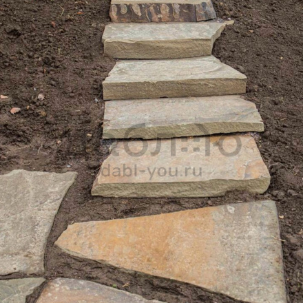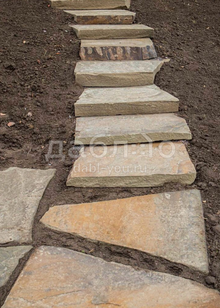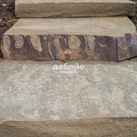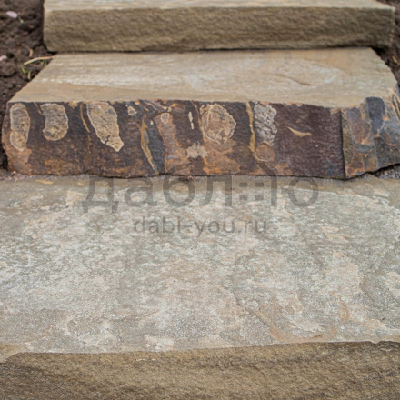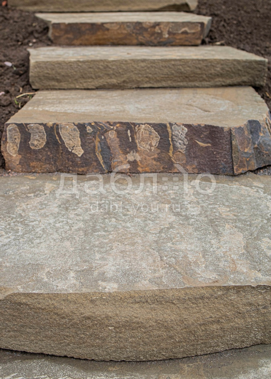 Толстомерная ступень из серо-зеленого песчаника. Красивый материал для украшения Вашего участка. Можно использовать для создания лестницы, водопадов, водоемов.Характеристики